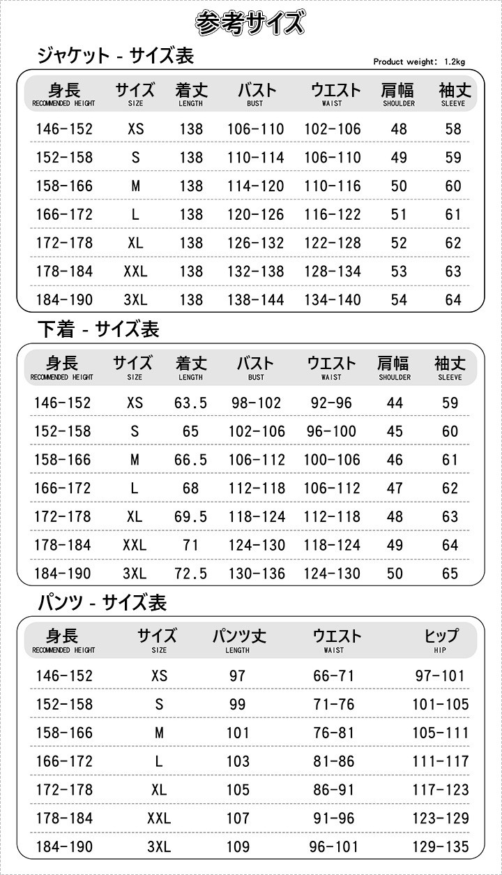 カスタマイズ寸法:性別、身長、肩幅、バスト、ウエスト、ヒップ